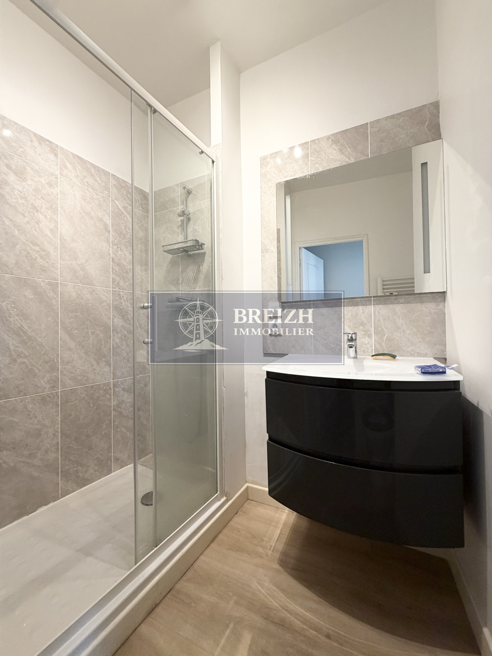 Vous trouverez à droite de l'entrée la salle d'eau composée d'une grande douche, d'un meuble vasque et d'un wc.